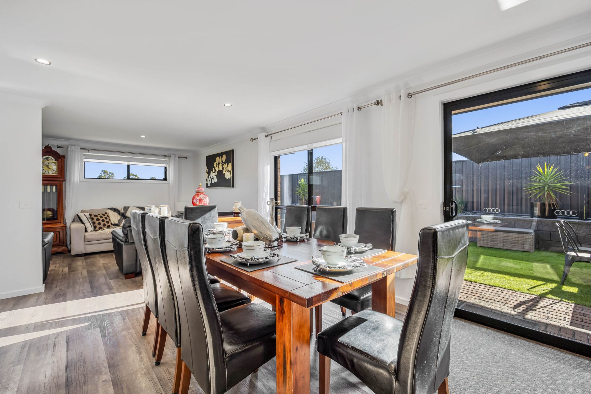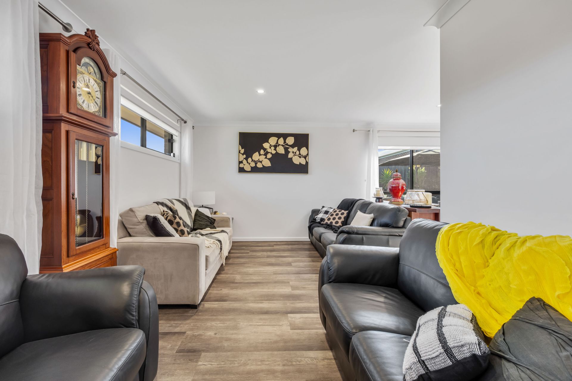 Inside, the home is thoughtfully designed with four generous bedrooms, two elegant bathrooms, and two inviting living areas. The north-facing kitchen and dining area are bathed in natural light, creating a warm and welcoming atmosphere. The master suite, located at the front, offers a luxurious retreat with a walk-in wardrobe and an ensuite complete with a shower, single vanity, and toilet. Two additional bedrooms come with built-in robes. The heart of the home features a modern kitchen and living area with a 900mm oven, induction stove, walk-in pantry, and dishwasher, complemented by extensive storage with deep, soft-close drawers. The second bathroom, located in a separate wing alongside two bedrooms, includes both a bath and shower, offering privacy and convenience.