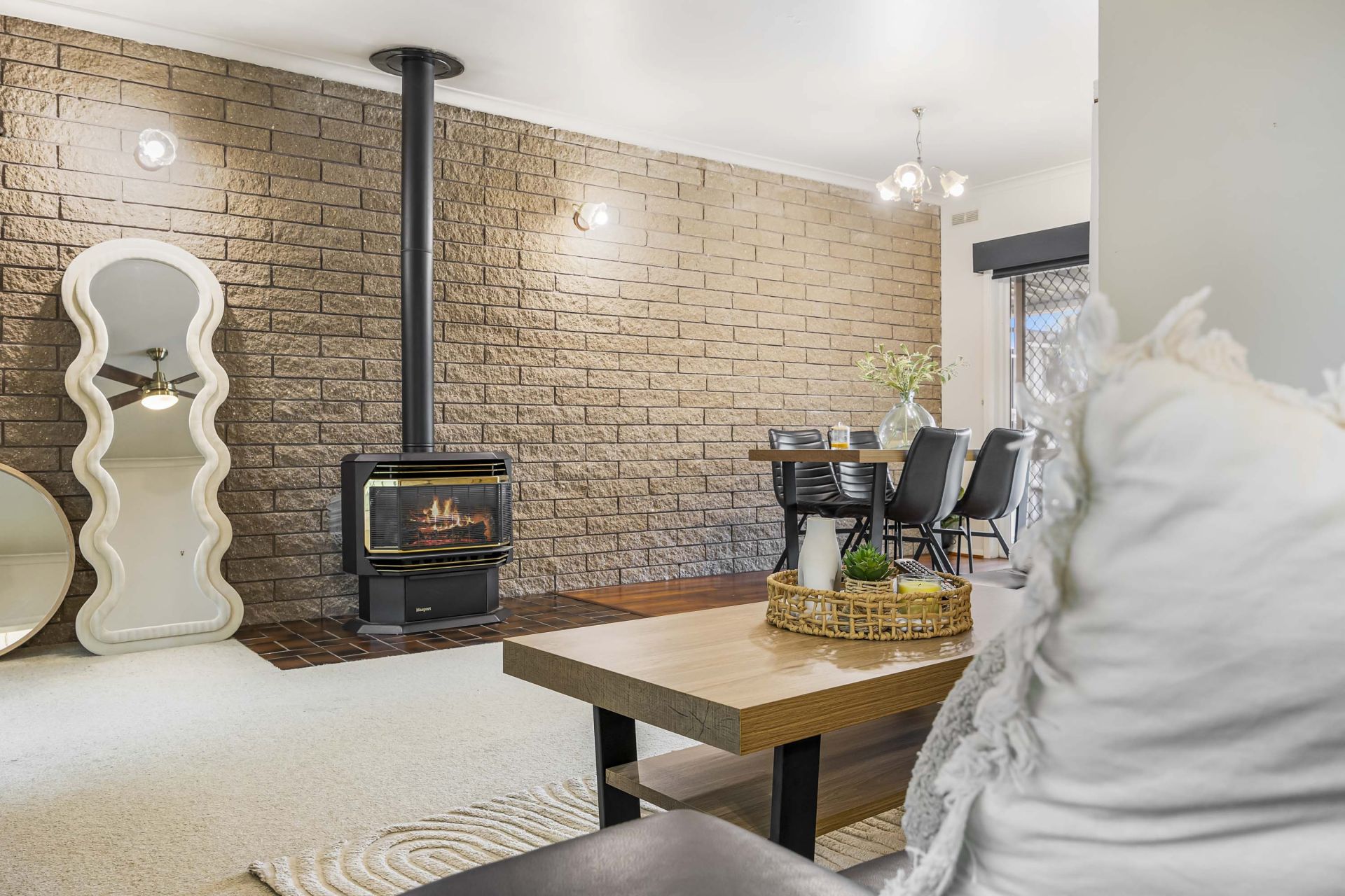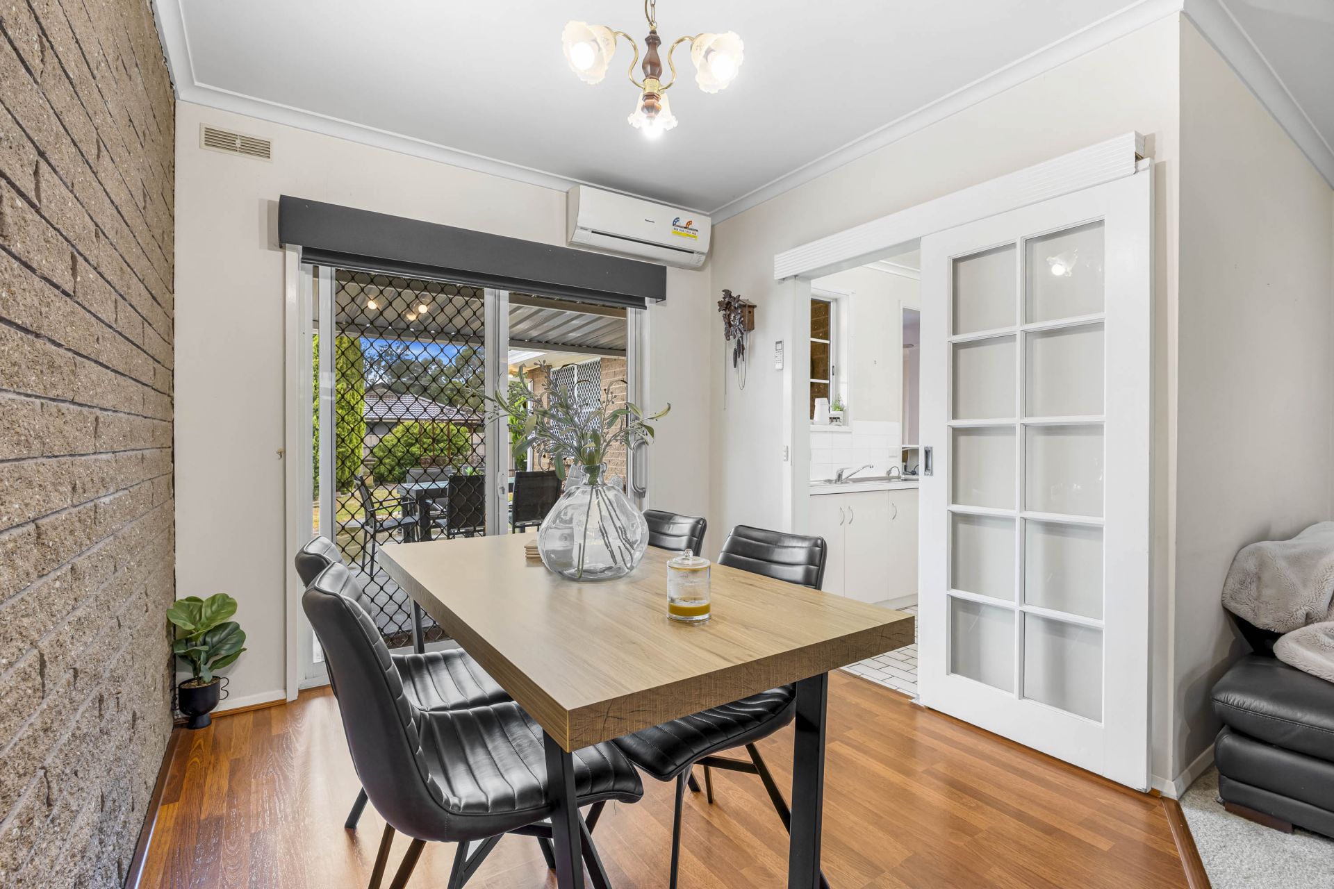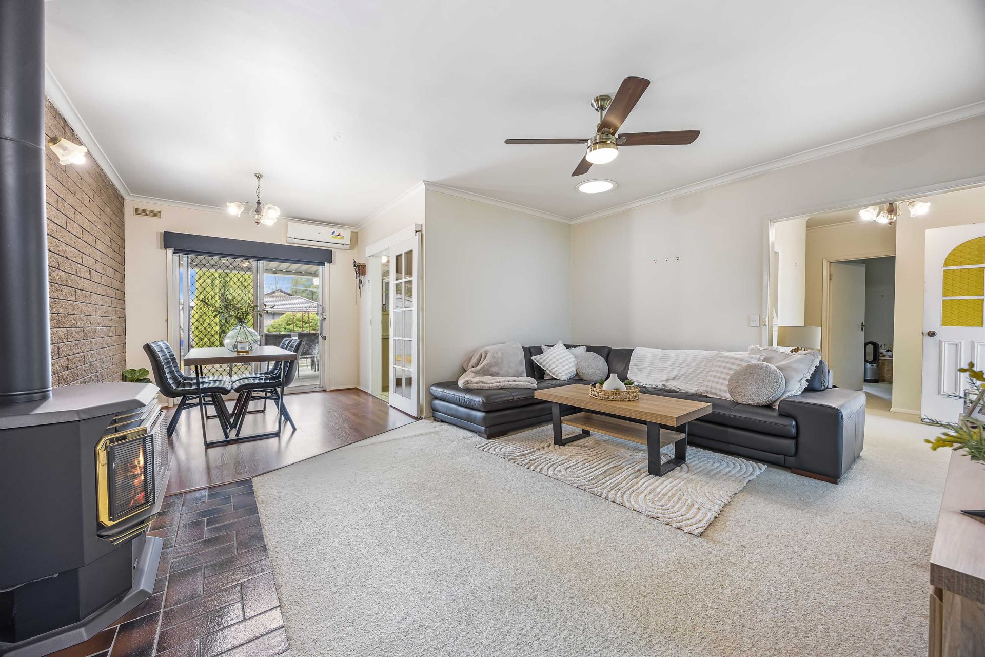 At the heart of the home, the well-equipped kitchen offers generous storage, electric cooking, and a dishwasher for added convenience. The adjoining dining area flows seamlessly into the main living space, where gas heating and a split system ensure comfort in every season.