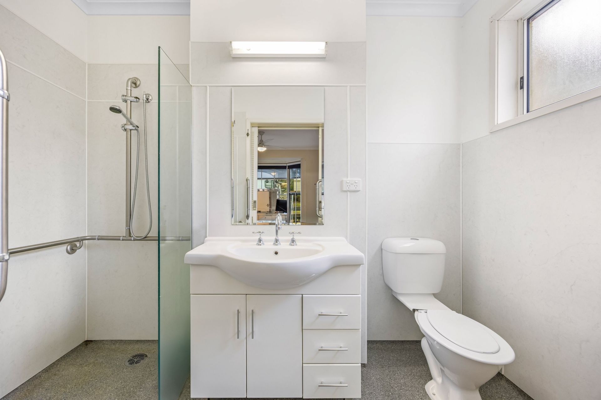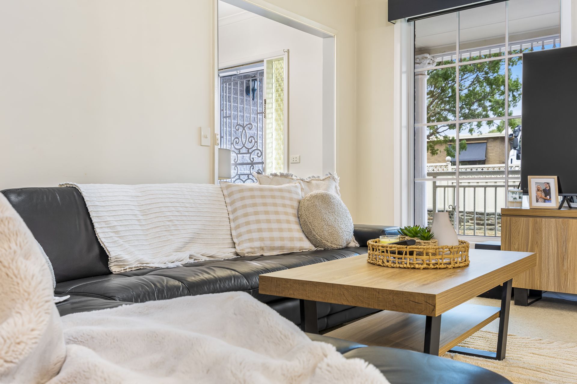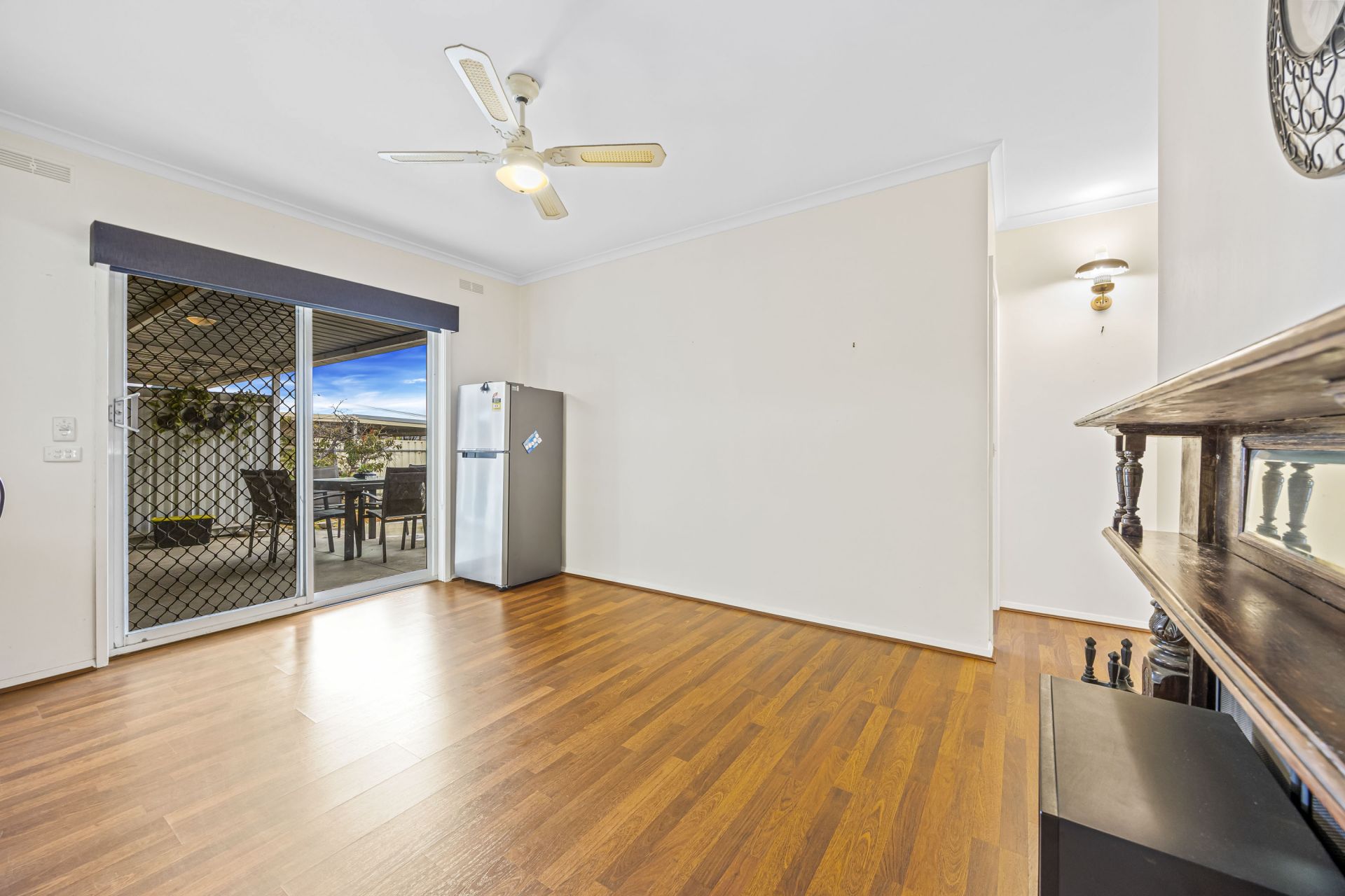 At the heart of the home, the well-equipped kitchen offers generous storage, electric cooking, and a dishwasher for added convenience. The adjoining dining area flows seamlessly into the main living space, where gas heating and a split system ensure comfort in every season.