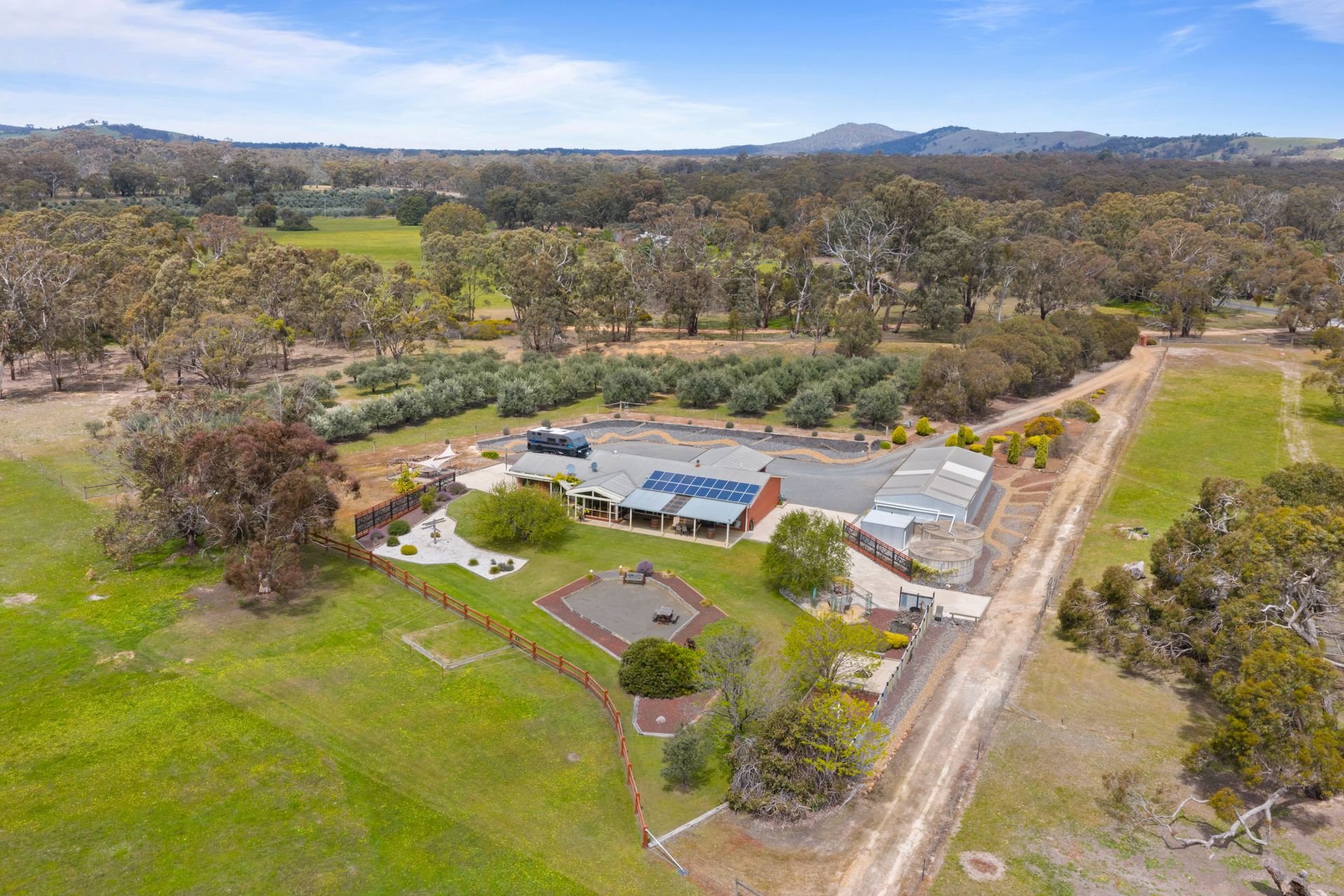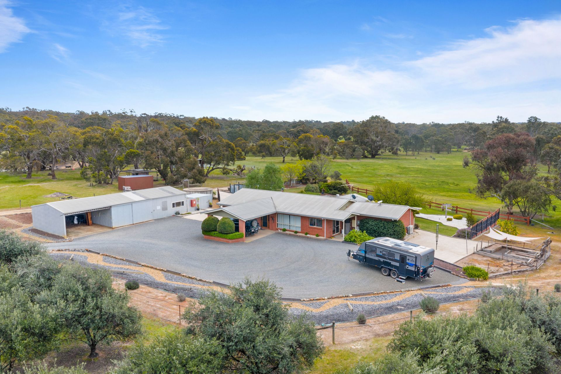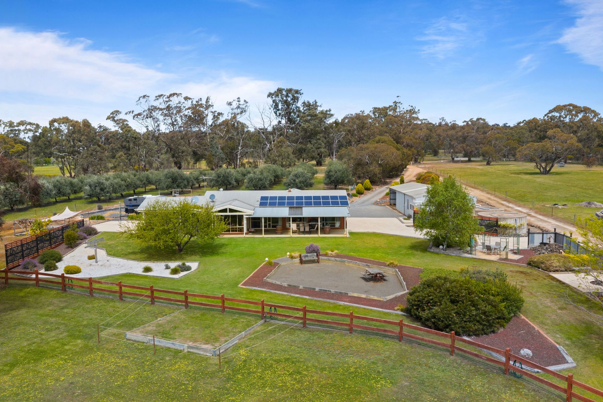 Outside, the home is surrounded by immaculate, landscaped gardens that create a peaceful and private setting. The property is well laid out with fenced paddocks, ideal for running stock, horses, or simply enjoying open space for leisure. A well-established olive tree plantation adds both character and potential, while the extensive shedding provides ample space for tools, equipment, vehicles, or workshop use.