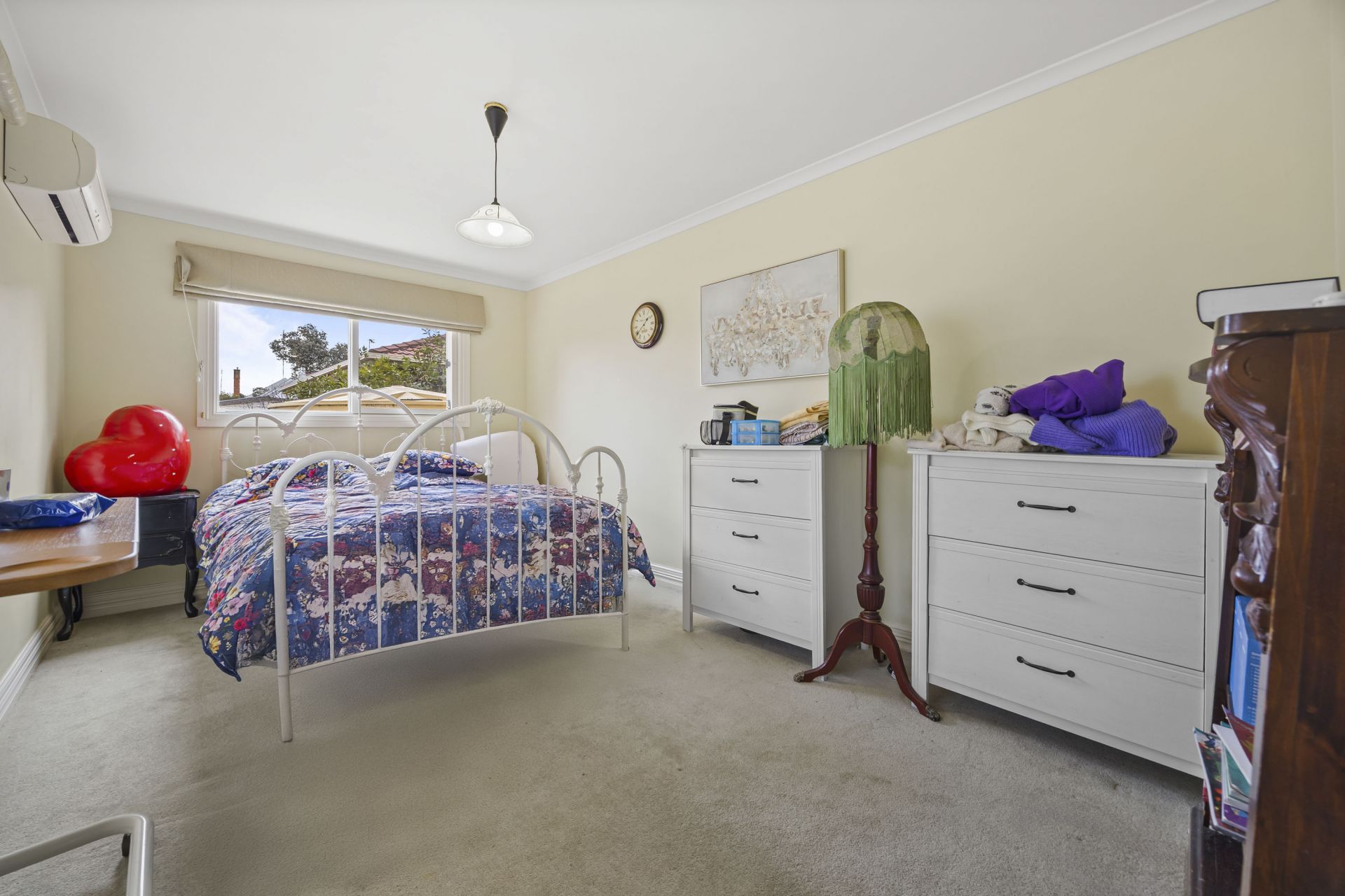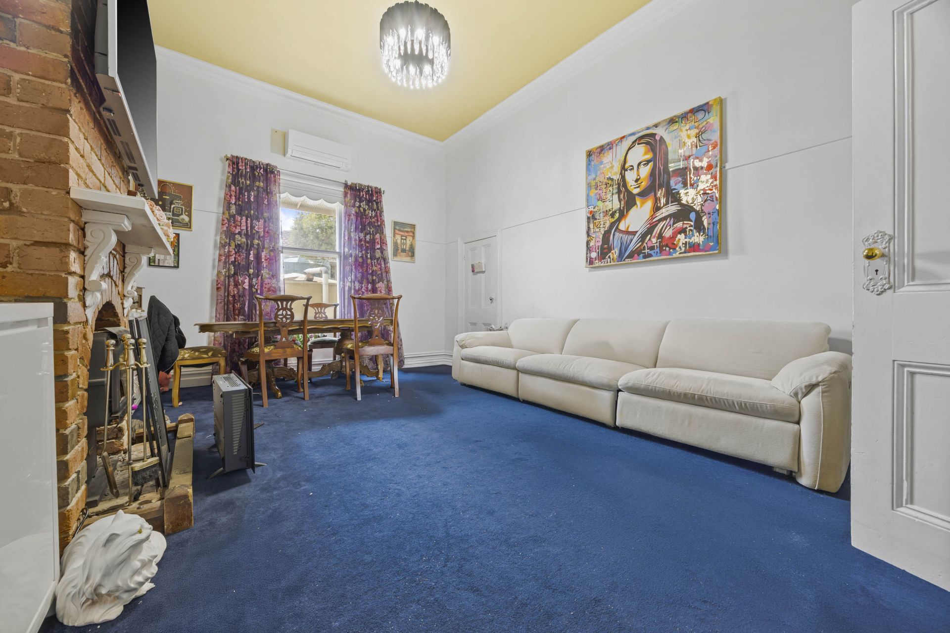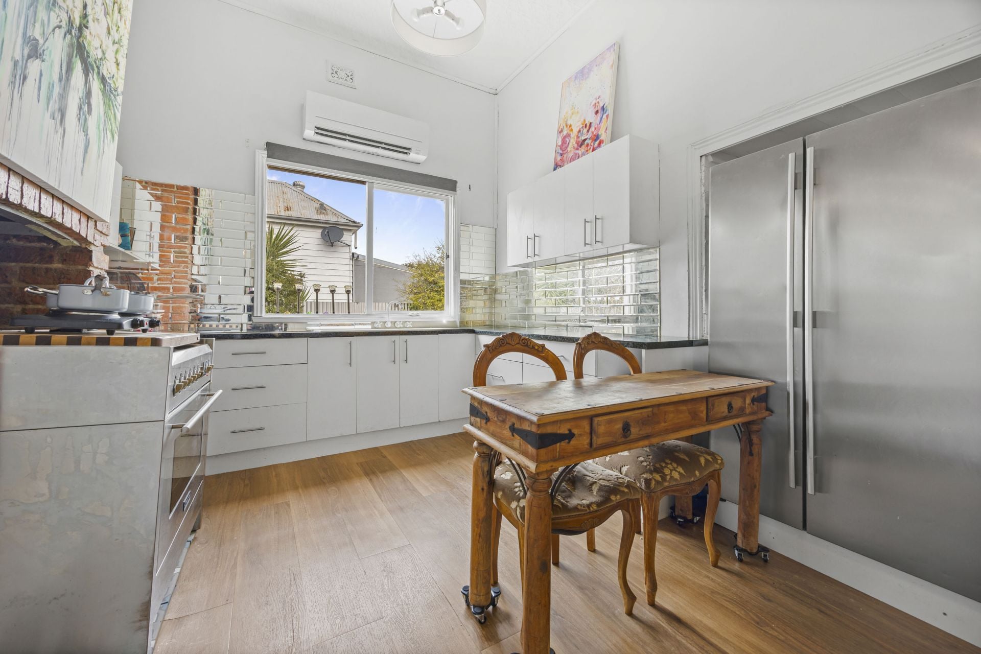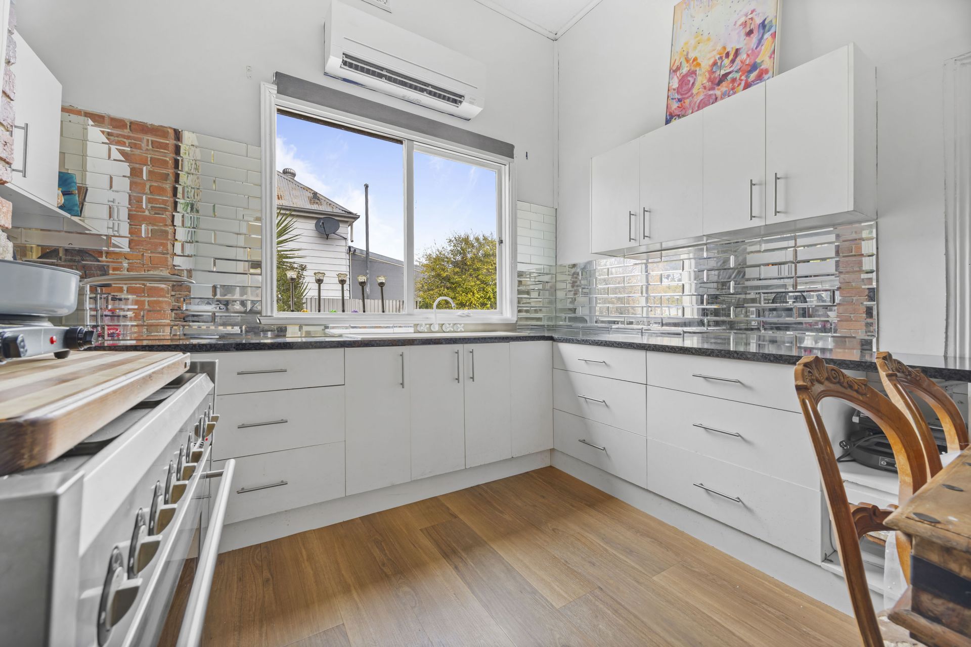 Character features including pressed tin ceilings, premium flooring, and tasteful window treatments create a cohesive and stylish interior. Two split system units and a wood heater ensure year-round climate comfort.